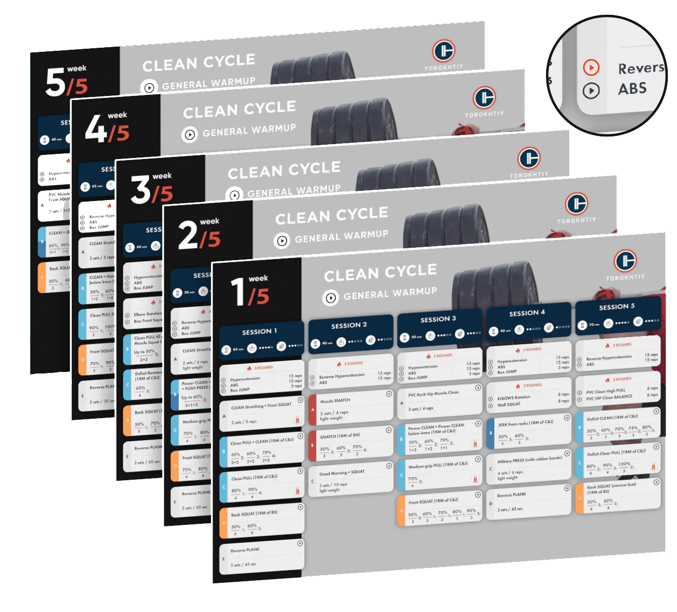Еach session is dedicated to CLEAN specific skills and drills. All workouts includes: special warmup routine for activation and prehab, consistent set of dynamic, strength and auxiliary exercises provide optimal training effect, rational alternation of heavy, technical and recovery sessions, which are balanced by volume and intensity.