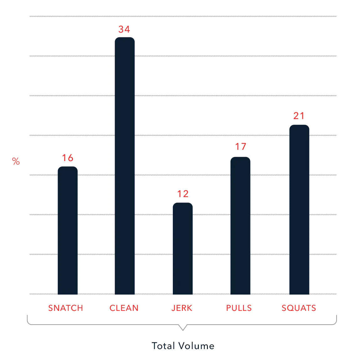 The main volume of the program's load is aimed at developing the CLEAN, but also the program contains sufficient volume in snatch & jerk exercises for “activating the muscle memory”.