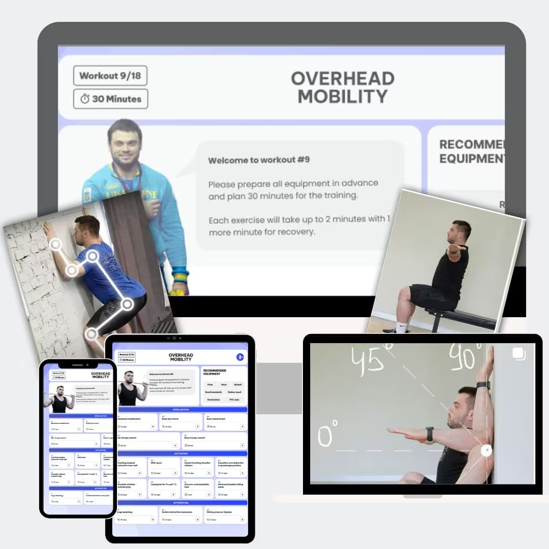 There's over 60 unique exercises designed to improve your overhead shoulder mobility.
