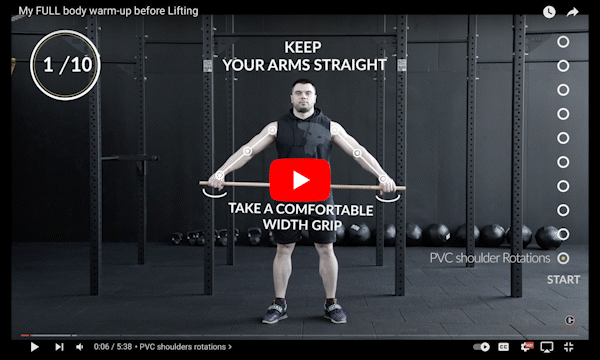 - warm up set for muscle activation and prehab, including static stretching;