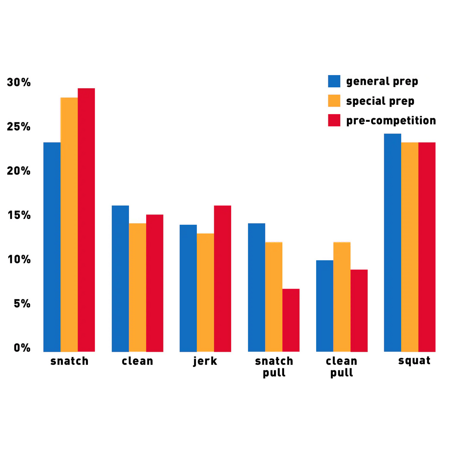 Depending on the period of preparation, the ratio of loads between the groups of exercises changes in waves.