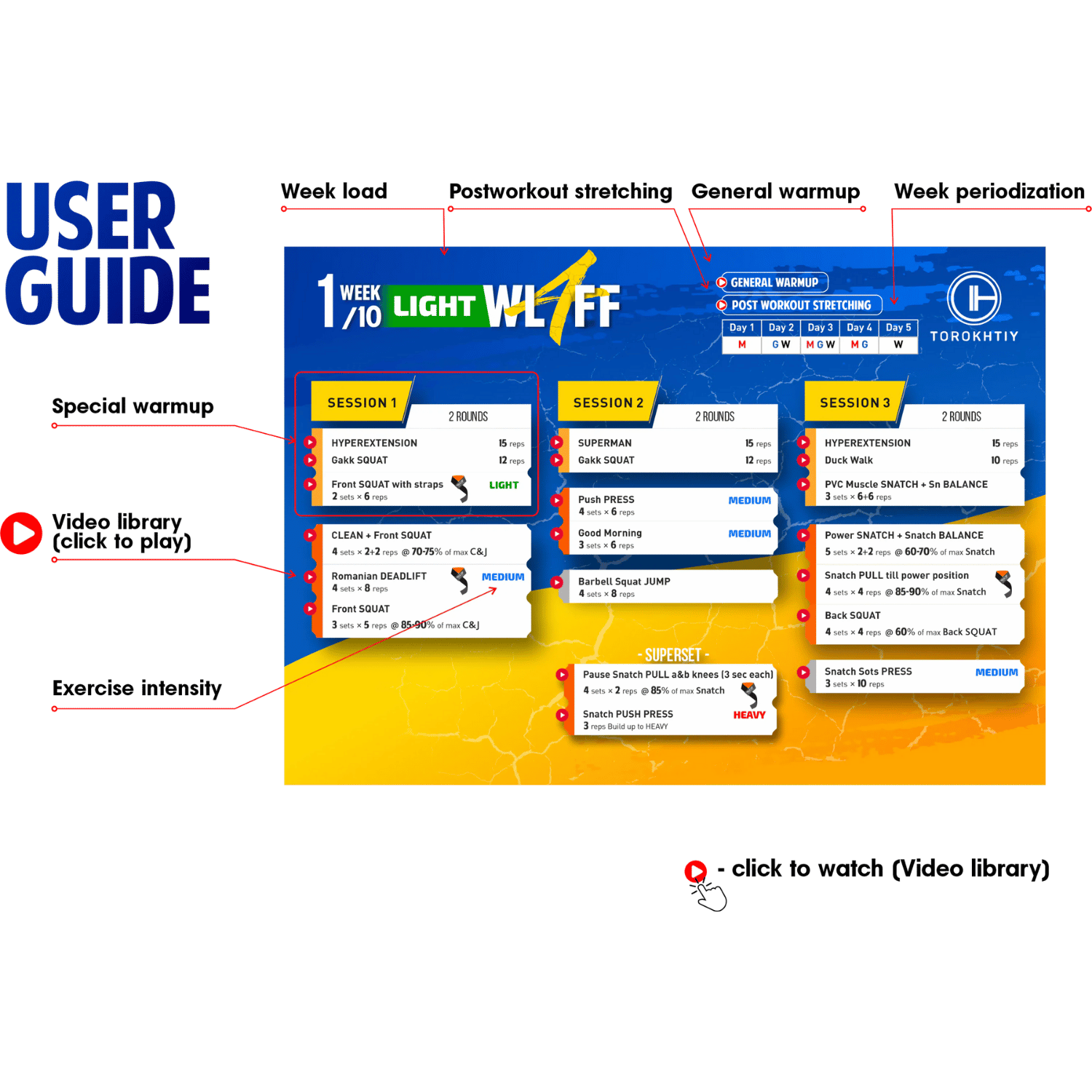 Each session is packed with a special warmup, Olympic lifting, and targeted auxiliary and technical exercises.